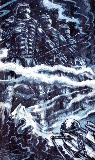 Обогнув искривленный «контрфорс», драккар попетлял среди «колонн». И когда, проникнув сквозь узкую арку, катер двинулся вдоль ребристо-выпуклой преграды, Андрей на первых секундах движения принял ее за очередной искривленный «контрфорс», наклонно уходящий кверху и вправо. Но это был очередной виток спирали… Сбило с толку, видимо, то, что на светлых, «подкрашенных» зеленым сиянием «Снегирях» трехметрового роста почти нигде не было ртутно-зеркального блеска. Так, местами… Совсем небольшие пятна. Зато превосходно были видны все детали скафандров. Отлично видна даже часть надписи на крышках скафандровых люков: