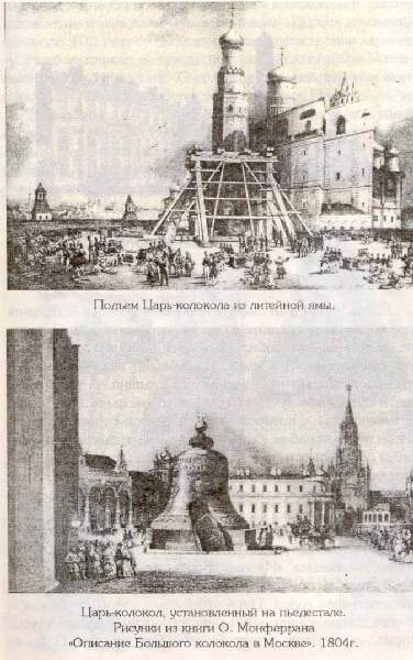 На Пушечном дворе отлит первый колокол – великан в 8.000 пудов, названный Большим Успенским. Работал над ним Емельян Данилов по приказу царя Алексея Михайловича в 1654 году. Извлекли колокол из литейной ямы, прозвонили благовест, и «от того благовесту... тот колокол разбился» – рассказывают исторические документы. Сам Емельян Данилов вскоре умер от моровой язвы. А государь приказал разбитый колокол перелить. И тут открываем интереснейший факт. Старые мастера уступили литье гиганта неизвестному тогда еще семнадцатилетнему юноше Александру Григорьеву, поручившись за его уменье. Сирийский путешественник, находившийся в то время в Москве, так описал внешность Александра: «Мастер, из переживших моровую язву, молодой человек, малорослый, тщедушный, худой, моложе 20 лет, совсем еще безбородый». Впоследствии Григорьев создаст считавшийся самым благозвучным Большой колокол Саввино – Сторожевского монастыря (погиб в 1941 году). А в то время, в начале своего пути к мастерству, ему удалось, несмотря на «тщедушный» вид, превзойти всех прежде бывших мастеров. За 10 месяцев он перелил расколовшийся колокол, пополнив его вес до 12.000 пудов. Окружностью он вышел в 19 метров, язык весил 250 пудов. Григорьев руководил литьем, сам делал литейную форму, надписи и изображения на колоколе. За огромные размеры прозвали его Царь колоколом. Из литейной ямы на колокольню Ивана Великого колокол подняли лишь через 13 лет – так тяжело было это сделать. Одни документы рассказывают, что для раскачивания языка требовалось 40 – 50, по другим – 100 человек. Но и этот колокол просуществовал недолго. В 1701 году он раскололся во время страшного кремлевского пожара.
