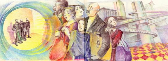Несколько долгих секунд царил полный мрак. Затем он мгновенно рассеялся, и солнечные лучи осветили здания причудливой конфигурации, уходящие в высокое голубое небо, и многоэтажные висячие дороги, по которым в разные стороны с огромной скоростью мчались какие-то разноцветные экипажи. На один короткий миг прямо перед путешественниками во времени, тесно прижавшимися друг к другу, вдруг возникла прекрасная девушка, идущая им навстречу, но тут же все опять заволок густой мрак, и осталось только прежнее басовитое гудение.