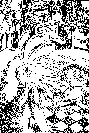 Вдвоем они отправились на кухню и приготовили себе завтрак. Обычно в этот час госпожа Брюкман еще спала. Но не успели господин Пепперминт и Субастик сесть за стол, как дверь распахнулась и в кухню – еще в халате – ворвалась госпожа Брюкман.