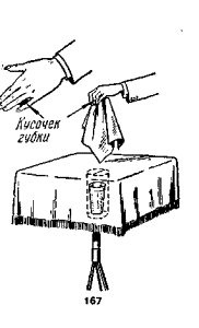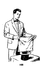На иллюзионном столе артиста стоит цилиндр или коробка. Исполнитель подходит к столу и достает из цилиндра платочек. Взяв его двумя руками, фокусник показывавает платок с обеих сторон зрителям (рис. 168).