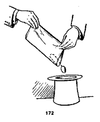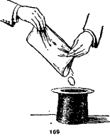 Затем исполнитель накрывает этим платком цилиндр так, чтобы два его угла были обращены к зрителю. Взяв платок за углы, артист складывает его вдвое, держа руки на одном уровне. Далее исполнитель натягивает сложенный вдвое платок по горизонтали, наклоняет его над цилиндром, произносит: «Ко-ко-ко», — и из платка в цилиндр выкатывается яйцо (рис. 169). После этого артист снова показывает платок с обеих сторон зрителям и вторично проделывает с ним те же самые манипуляции — из платка в цилиндр выкатывается еще одно яйцо. И сколько бы раз артист ни повторял этот фокус, каждый раз из платка в цилиндр выкатывалось яйцо. Не платок, а настоящая несушка-рекордистка.