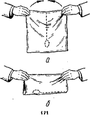 Показав с обеих сторон платок зрителям, исполнитель раскладывает его на цилиндре свободными углами к зрителям. Затем он берет платок за ближайшие к нему углы (рис. 171), совмещает их, зажав пальцами правой руки, а левой берется за кромку середины платка. В руках фокусника оказывается сложенный вдвое платок (см. рис. 171). Он приподнимает его над цилиндром, и передает середину кромки сложенного платка из левой руки в правую, продолжая держать углы. Освободившейся левой рукой артист берется за два других угла; Затем исполнитель натягивает сложенный вдвое платок по горизонтали и, чуть наклонив его влево над цилиндром и приподняв правую часть платка, произнеся «магическое»: «Ко-ко-ко», — дает возможность выкатиться яйцу (рис. 172).