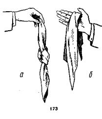 Теперь артист берет в правую руку (также по диагонали) другой платок, который надо будет мгновенно завязать в узел. Для этого платок располагают так, чтобы одна его половина висела вдоль ладони, другая (чуть меньшая) — вдоль ее тыльной стороны (рис. 176). Середина платка придерживается большим пальцем. Не изменяя положения платка, фокусник зажимает половину платка, висящую вдоль ладони, между средним и безымянным пальцами (см. рис. 176, а).