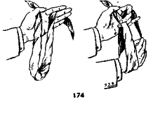 Чтобы получился такой узел, артист перекладывает конец платка из правой руки под большой палец левой (рис. 174). Затем он пропускает правую руку снизу в петлю и захватывает конец платка, зажатый указательным и средним пальцами левой руки, (см. рис. 174). Одновременно средним и безымянным пальцами левой руки он зажимает ту сторону петли, конец которой находится между большим и указательным пальцами левой руки.