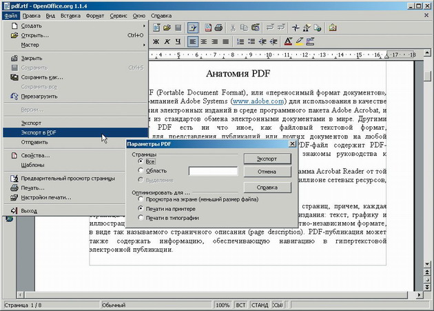 Действительно, зачем простому менеджеру вникать в тонкости настроек, а, стало быть, тратить рабочее время? Нажал на кнопку – получил результат. По большому счету, PDF-инструмент в OpenOffice.org 2.0.2 не имеет сколь-нибудь значимых настроек, все сводится к выбору трех степеней компрессии (меню Файл» Экспорт в PDF» Оптимизировать для…), что позволяет прийти к компромиссу между размером создаваемого файла и качеством внедренной графики ( рис. 6 ).
