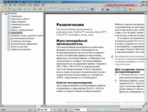 Так же как и Adobe Reader, он поддерживает закладки документа, великолепно отображает графику, позволяет копировать текст и создавать скриншоты выделенных фрагментов PDF-документа. Причем кнопки инструментальной панели Foxit Reader выглядят так же, как и в Adobe Reader. Единственный недостаток такого решения – отсутствие русификации интерфейса.