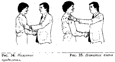 Прикосновение к плечу (рис. 35) или к предплечью (рис. 34) затрагивает особо интимную зону и может привести к сближению' или прикосновению тел. Это возможно только между людьми, испытывающими особо эмоциональный подъем в момент пожатия. Если испытываемое чувство не является обоюдным, или если инициатор не имеет особых оснований для приветствия с применением обеих рук,.то реципиент может почувствовать недоверие или подозрительность относительно намерений инициатора. Часто можно видеть, как политические деятели.приветствуют своих избирателей с помощью этого жеста, или агенты по продаже приветствуют своих клиентов с помощью обеих рук, не осознавая, что это означает для них политическое самоубийство или загубленную сделку.
