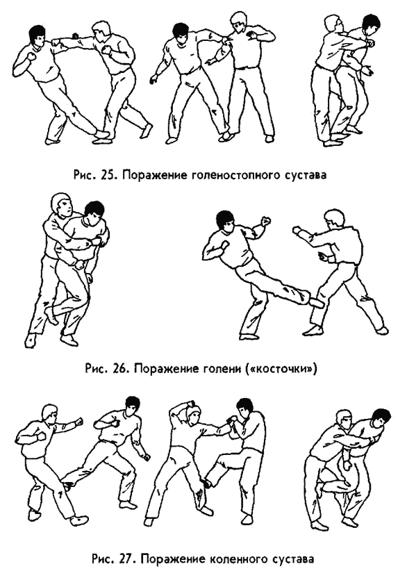 Однозначно считается всеми специалистами, что колено — наилучшая мишень для ударов ногами в нижнем уровне. По нему удобно бить со всех сторон, любой частью стопы, под любым углом (сверху вниз, снизу вверх, по горизонтали), любым движением — толчковым, маховым, топчущим (рис. 27).
