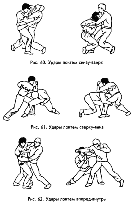 Удары, производимые за счет движения всего корпуса вперед (с разбега, в нырке или в момент выхода из кувырка) либо снизу-вверх, в момент подъема корпуса (эти удары тоже показаны на рисунках 57—58).
