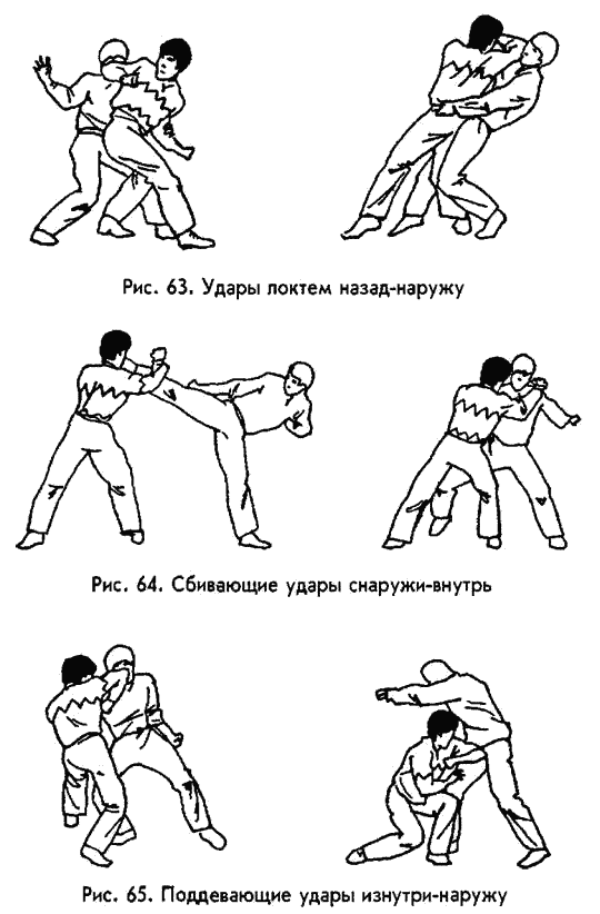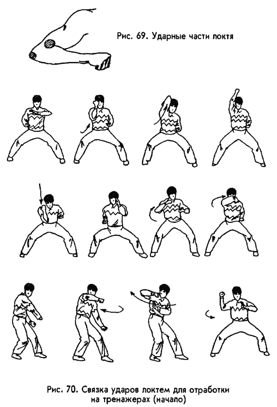 Разумеется, удобство выполнения и поражающее воздействие у этих ударов не одинаковы. Подберите себе те из них, которые получаются у вас лучше других, и шлифуйте их с помощью тренажеров на каждой тренировке. Достаточно, если вы хорошо освоите хотя бы два удара локтем. Четырех будет более, чем достаточно. Что же касается остальных, то можно ограничиться ежедневным повторением связки, объединяющей все перечисленные здесь удары локтем (она показана на рисунке 70— 71)
