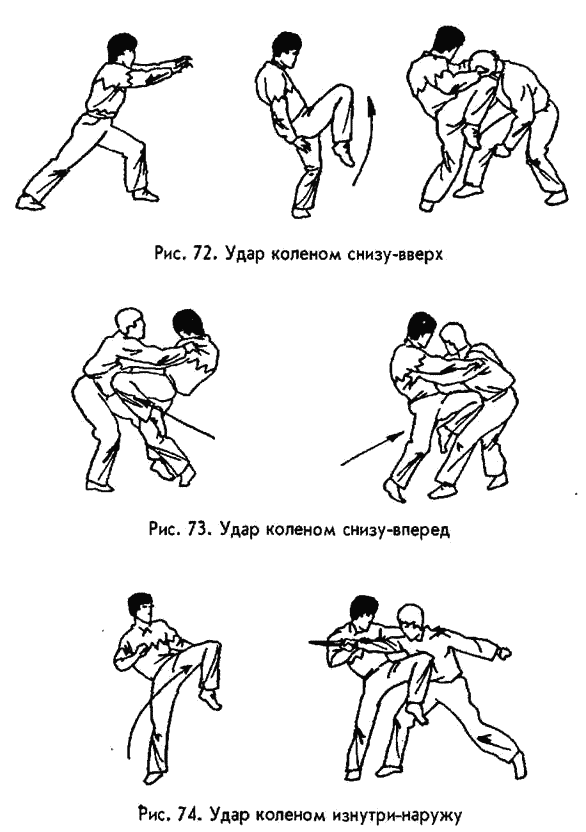 Однако в качестве средства первого удара колено используют редко, гораздо чаще его применяют для контратак и добивания. То и другое обычно сочетают с захватом руками за плечи, голову или руки противника, чтобы «натягивать» его на себя. Ударом колена вперед можно поразить пах либо живот, сбоку удается сломать ребра или позвоночник, ударом вверх — разбить лицо, перебить руку, травмировать грудную клетку… Если противник пытается ударить вас ступней, то поднятое колено защитит пах и живот, смягчит удар по ногам, отведет вражескую атаку в сторону. При этом подставка колена под удар может служить исходной позицией для большого шага (либо рывка) вперед прямо и по диагонали.