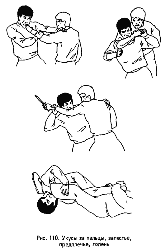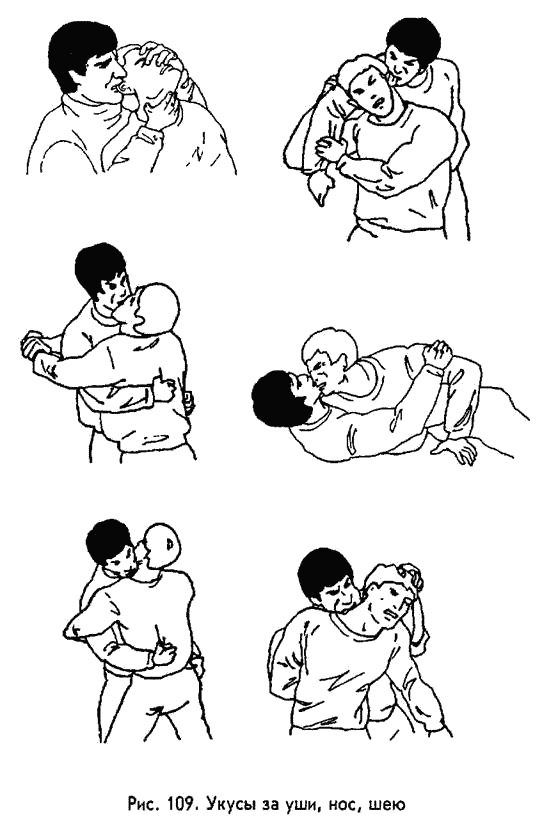 Все же проще кусать те участки, которые оголены, либо ограждены от внешней среды чем-нибудь тонким, скажем, рукавом сорочки, майкой или носком. Да и сами эти участки различаются между собой по силе болевых ощущений, возникающих от укусов. Исходя из сказанного, рекомендую две основные зоны атаки для ваших зубов — руки и голову с шеей. Вверху можно выделить три главные цели: уши, нос, боковую часть шеи (рис. 109), на руках — две: пальцы и предплечья (рис. 110). Запомните, что кусать надо движением, поворачивающим голову вокруг вертикальной оси (справа налево или слева направо), а не поднимающим ее вверх либо опускающим вниз. Непосредственно перед укусом требуется максимально обнажить зубы путем напряжения и отведения в стороны губ. Иначе вы пораните их о свои же зубы. Кстати, возникающий при обнажении зубов оскал производит удручающее впечатление на психику противника, особенно, если вы одновременно начнете рычать и всем своим видом демонстрировать ненасытную жажду свежей крови.