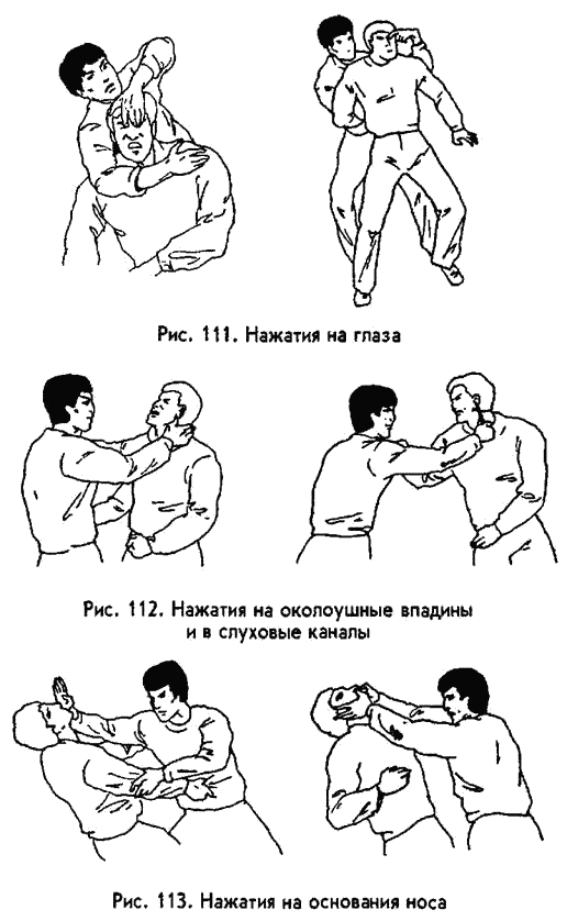 Что касается глаз (рис. 111) и половых органов (рис. 115), здесь особых пояснений не требуется. Нос лучше всего атаковать давящим движением больших пальцев (или «вилкой» между большим пальцем и указательным) в направлении снизу-вверх (рис. 113). При резком нажатии противник обязательно запрокинет голову назад, и тогда откроется возможность той же рукой ущемить ему кадык (щитовидный хрящ, выступающий на горле у мужчин; китайцы называют эту цель точкой «ляньцюансюэ»). Ущемление производится большим пальцем и основанием указательного справа и слева к центру. Для усиления болевого воздействия можно сочетать ущемление хряща со скручиванием (рис. 114).