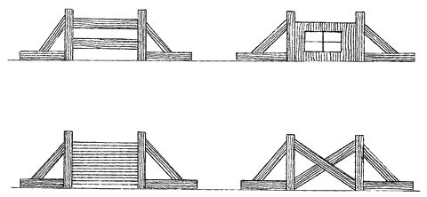 Они бывают одиночными, двойными и тройными. Барьеры должны устанавливаться между двумя стойками, обеспечивающими необходимую устойчивость конструкции. Эти препятствия могут изготавливаться из отдельных планок или сплошных щитов. Двойные и тройные барьеры состоят из 2–3 одиночных, устанавливаемых последовательно с учетом увеличения высоты препятствий. Наиболее высокий элемент размещается последним и имеет высоту 0,75 м. Ширина барьеров должна составлять не менее 1,2 м.