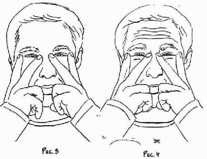 2 Теперь, удерживая брови в верхнем положении, продолжая надавливать пальцами вниз, делайте бровями мини-движения вверх пока не почувствуете натяжение вдоль бровей (см. рис. 6). Почувствовав давление или жжение, считайте до тридцати. Расслабьтесь и круговыми движениями помассируйте брови около переносицы.