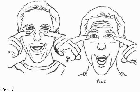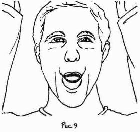 Примите исходное положение (см. с. 33). Представьте себе точку посредине верхней губы и другую — посредине нижней губы. Откройте рот, раздвигая воображаемые точки (см. рис. 7). Губы образуют овал. Поместите указательные пальцы на верхнюю часть щеки (яблоко), не надавливая. Улыбнитесь, приподнимая только уголки губ. Опустите уголки губ. Вы должны чувствовать, как щеки двигаются под указательными пальцами. Мысленно представляйте себе это движение щек. Повторите движение 25 раз. На счет 25 сильно оттяните верхнюю и нижнюю губы друг от друга, воображая, как щеки покидают ваше лицо и двигаются к потолку, а затем исчезают, как два маленьких воздушных шарика.