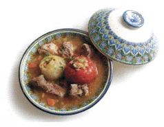 Считаю уместным подчеркнуть, что я бы подавал этот обед именно в такой вот последовательности: фаршированные овощи, шашлык и только потом уже суп! Так поступала одна моя знакомая, которая умела обед из шести-семи горячих блюд подать таким образом, что гости ничего не оставляли, ни отчего не отказывались и тем не менее могли потом самостоятельно встать из-за стола (правда, часов в 9 вечера, не раньше).