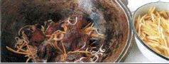 Пора добавить огня: дадим закипеть воде по всей поверхности казана. Когда вода начнет уходить с поверхности риса, нам один раз придется проделать следующую операцию: осторожно приподнимая слой риса (стараясь не задеть слой моркови и гороха), переворачиваем его, опуская верхнюю часть риса вниз, где еще есть вода и масло. Убедившись, что вода выпарилась почти вся, соберем рис горкой и осторожно, чтобы не проткнуть стручки перца, что лежат внизу, проделаем отверстия в слое риса. Дождемся, пока вода вся выкипит, и, уменьшив огонь до минимума, закроем рис миской. Кстати, мягкие сорта риса, в отличие от дев-зиры или басмати, лучше не доваривать до конца, а оставить полуготовыми.
