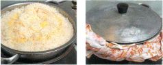 Дать прокипеть содержимому казана на сильном огне, пока не нагреется крышка дуршлага, затем убавить пламя до среднего. Через сорок минут проверить рис и количество воды в казане. Если воды осталось мало, а рис еще не готов, можно просто долить в казан немного кипятка. Если воды еще много, а рис уже практически сварился, следует сделать огонь посильнее и убрать салфетки, чтобы пар выходил свободно. К моменту готовности риса воды в казане оставаться не должно вовсе, но и давать пригореть содержимому тоже, разумеется, нельзя.