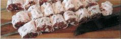 Порезать рулет на кусочки, насадить на шампуры и немедленно начинать жарить на сильных углях, следя, чтобы не вспыхнуло сало.