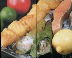 Некрупную рыбу мариновать в масле с солью, белым перцем, а перед запеканием на мангале завернуть в маринованные виноградные листья.