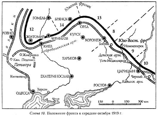 Части белых армий во многих случаях действовали очень удачно. Офицерские части дрались упорно и ожесточенно, а наличие крупных конных частей, особенно в первый период кампании 1919 г., давало в руки белых неоценимое преимущество над красными войсками, ибо позволяло в широкой степени применять маневрирование, создавать превосходство в силах в момент, когда этого менее всего ожидали, и сводить на нет достигнутые перед тем красными успехи. Однако свое преимущество белые использовали часто не по нужному направлению. Мы уже указывали, что продвигаться на север весной было излишним, и белые имели все основания попытаться закончить борьбу в пределах Донской области. Но плохая политика определяла собой плохую стратегию, и белые испытали на своей шкуре все невыгоды последней. Бесконечное расползание в пространстве (Днепр - Волга) при отсутствии должного количества сил ни в какой степени не способствовало дальнейшему продвижению в центре, а правый фланг был безнадежен в отношении успеха. Однако что касается боевой деятельности Добровольческой армии, то мы должны признать за ней ряд крупных успехов и подчас весьма умелые действия. Начиная с ликвидации группы Селивачева у Купянска и блестящего применения здесь конного маневра, дальнейшие действия Добровольческой армии протекают в строгой последовательности и соответствии с поставленными ей по «Московской директиве» задачами. Армия прорывает фронт у Курска и незамедлительно приступает к обеспечению дальнейшего своего продвижения, расширяя этот прорыв до стратегических размеров и проявляя нужную заботливость об обоих своих флангах. Но по мере продвижения к Орлу левый фланг постепенно начинает выпадать из внимания командующего Добровольческой армией, и это обстоятельство сыграло гибельную для всей операции роль. Начавшееся с отходом разложение армии приостановить уже не удалось, и белые отходили почти без серьезных попыток оказать сопротивление, если не считать Тимского эпизода, значение которого мы уже отмечали. При той картине морального упадка армии, которая нами описана в предыдущих главах, ничто уже не могло спасти белых; даже переброска кубанских частей с Царицынского участка не могла повлиять на ход событий, и белые продолжали безнадежно отходить. Следует, однако, по справедливости отметить, что Деникин, вовремя разгадавший основную идею красных о разделении его армий на две части, сумел, несмотря на катастрофическое положение своих войск и безупречную деятельность нашей конницы, вывести войска из-под ударов и хоть с жалкими остатками уйти за реку Дон.