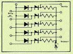Напряжение переключения 4-слойного диода выбирается большим напряжения питания V0. При подаче на вход одной из параллельных цепей схемы короткого положительного импульса 4-слойный диод открывается и пропускает ток через сопротивление R1. Положительный уровень напряжения, устанавливающийся на сопротивлении R1, будет удерживаться до тех пор, пока все 4-слойные диоды схемы не будут возвращены в исходное состояние размыканием цепи возврата.