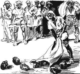 Тем временем в воротах показалась группа «десперадос». Пятеро несли на спинах небольшие джутовые мешки, из которых что-то сочилось.