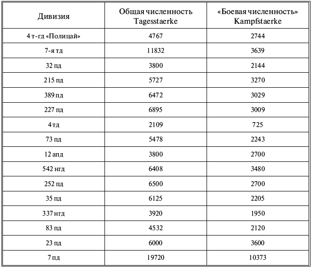 Для развития успеха 2-му Белорусскому фронту директивой Ставки № 11034 6 марта была передана из состава 1-го Белорусского фронта 1-я гв. танковая армия. Вместе с танковой армией М.Е. Катукова 2-му Белорусскому фронту передавалась 1-я польская танковая бригада. Разумеется, переход танковых соединений из подчинения одного фронта в подчинение другого не произошел мгновенно. Официально армия передавалась в подчинение К.К. Рокоссовского с 12.00 8 марта. 6 марта 1-я гв. танковая армия продолжала бои по уничтожению окруженных групп противника в районе Шифельбайна. В ходе этих боев было захвачено в плен 1960 солдат и офицеров противника. 7 марта сражение с рвущимися на запад разрозненными отрядами продолжилось. В 7.30 7 марта одна из таких групп напала на подразделения штаба армии М.Е. Катукова. Части штаба понесли потери в личном составе и автотранспорте. Только во второй половине дня 7 марта войска 1-й гв. танковой армии приступили к сдаче занимаемых позиций 1-й армии Войска Польского. Выдвижение в район Кезлина началось в ночь на 8 марта. Первый боевой приказ от штаба К.К. Рокоссовского армия получила 8 марта. В нем предписывалось перейти в наступление с утра 10 марта. Боевой потенциал 1-й гв. танковой армии к тому моменту еще сохранялся. Армия М.Е. Катукова на 10 марта 1945 г. имела в строю 302 танка Т-34, 17 танков ИС-2, 27 СУ-85, 34 СУ-76 и 75 СУ-57. Артиллерия армии насчитывала 285 орудий, 79 минометов калибром 120 мм и 35 установок реактивной артиллерии. Отсеченные от основных сил группы армий «Висла» прорывом советских войск к Балтийскому морю соединения немецкой 2-й армии в середине марта еще сохраняли боеспособность (см. Таблицу). Для сравнения – 9-я армия под командованием Вальтера Моделя наступала в июле 1943 г. на северный фас Курского выступа при средней «боевой» численности дивизий 3500 человек. Отставая от 2-го Белорусского фронта в общем числе соединений, 2-я армия превосходила советские войска по средней численности дивизии.