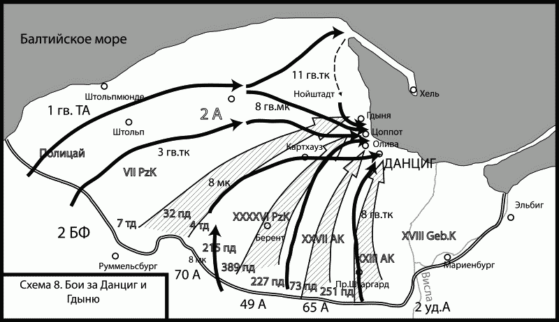 Статус военно-морской базы обеспечивал Данцигу поддержку кригсмарине, в частности «самой большой канонерки Балтики» – тяжелого крейсера «Принц Ойген». За двадцать шесть дней осады крейсер расстрелял 4871 снарядов 20.3-см калибра и 2644 снарядов 10.5-см калибра. Когда он покинул данцигскую бухту, в погребах осталось всего 40 снарядов 20,3-см калибра. В связи со всем вышесказанным нельзя не отметить определенной самонадеянности К.К. Рокоссовского, отказавшегося от окружения отходящей на Данциг группировки противника до ее выхода на внешний обвод укреплений города.Но так или иначе, препятствовавшие наступлению 2-го Белорусского фронта в Восточную Померанию дивизии противника были наказаны. Они были отсечены от основных сил германской армии и зажаты на узком пространстве на берегу моря без всякой надежды на спасение. Немецкая 2-я армия была передана из группы армий «Висла» в группу армий «Север». 12 марта командовавший 2-й армией генерал-полковник Вальтер Вейс был назначен командующим группой армий «Север», его преемником на посту командующего 2-й армией стал командир 4-й танковой дивизии генерал танковых войск Дитрих фон Заукен. К.К. Рокоссовским был намечен следующий план разгрома и уничтожения группировки противника. Главный удар должен был наноситься в направлении на Цоппот (небольшой курортный городок между Данцигом и Гдыней) с тем, чтобы рассечь оборонявшуюся группировку противника и уничтожить ее по частям. Было решено прорвать оборону противника и выйти на побережье Данцигской бухты в районе Цоппота, в дальнейшем ударами с различных направлений по Данцигу и Гдыне овладеть этими городами и завершить разгром 2-й армии. В соответствии с принятым решением командующий войсками фронта поставил задачи войскам. Выполнение главной задачи по рассечению группировки противника было возложено на войска двух армий, усиленных двумя танковыми корпусами. Они должны были, продолжая наступление к Данцигской бухте, прорвать оборону на участке Эспенкруг, Витцлин и не позднее 14 марта овладеть пригородом Олива и портом Цоппот. В дальнейшем одна из армий нацеливалась на штурм Данцига с северо-запада, а вторая должна была наступать на Данциг с севера вдоль берега Данцигской бухты. Для борьбы с боевыми кораблями противника и недопущения их подхода к причалам командующему войсками 49-й армии было приказано выдвинуть на берег бухты дальнобойную артиллерию и ее огнем воспретить подход кораблей противника к Данцигу.