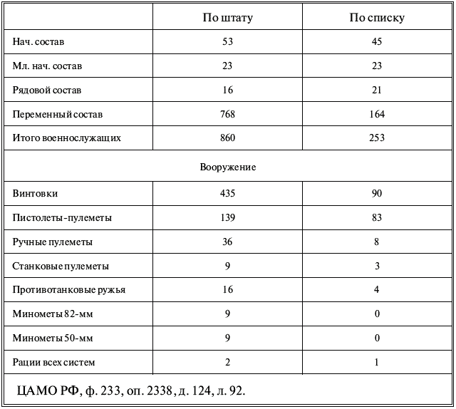 Отдельную группу среди войск, изготовившихся к Берлинской операции, составляли штрафники. В составе 1-го Белорусского фронта был один штрафной батальон и двадцать шесть штрафных рот. Чаще всего в общевойсковой армии фронта было три отдельных штрафных роты. Штрафники были поражены той же болезнью, что и стрелковые соединения Красной армии в тот период – катастрофически низкой комплектностью личного состава. В 8-м штрафбате было около трети полагающегося по штату количества солдат, сержантов и офицеров (см. таблицу).Боевой и численный состав 8-го отдельного штрафного батальона 1-го БФ по состоянию на 15 апреля 1945 г.