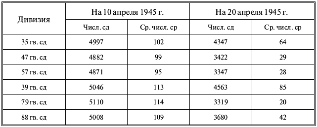 Однако штурм собственно Зееловских высот и обходные маневры дорого стоили 8-й гв. армии, учитывая изначально слабый состав ее соединений. К сожалению, автору не удалось обнаружить детальных данных по динамике потерь армии В.И. Чуйкова. Но имеются данные по численности стрелковых дивизий 8-й гв. армии к началу операции и к моменту прорыва одерского рубежа обороны (см. таблицу).