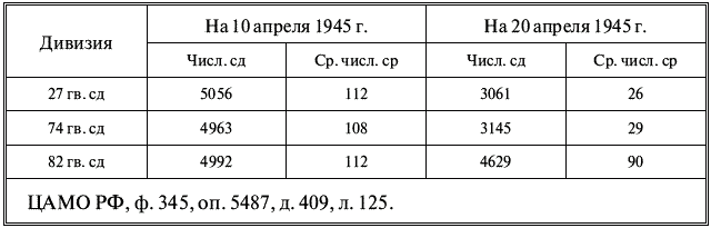 Хорошо просматривается почти катастрофическое падение численности стрелковых рот в большинстве дивизий 8-й гв. армии. При этом в 47-й гв. стрелковой дивизии число рот было сокращено с 12 до 10, а в 57-й гв. стрелковой дивизии – до 11. Потери техники также были довольно серьезными. За период с 10 по 20 апреля 1945 г. 8-я гв. армия потеряла 54 ИС-2, 22 Т-34, 19 ИСУ-152, 58 СУ-76 и 536 человек из состава экипажей убитыми и ранеными [237] . В танковых частях армии на 20 апреля осталось 32 ИС-2, 31 Т-34 (с учетом прибывшего пополнения), 2 ИСУ-152, 45 СУ-76. В 105-м тяжелом танковом полку 7-й гв. тяжелой танковой бригады к 20 апреля осталось 6 боеготовых танков, которые были переданы 104-му и 106-му полкам бригады. 105-й полк был выведен из боя, и бои за Берлин бригада ИСов вела в двухполковом составе.