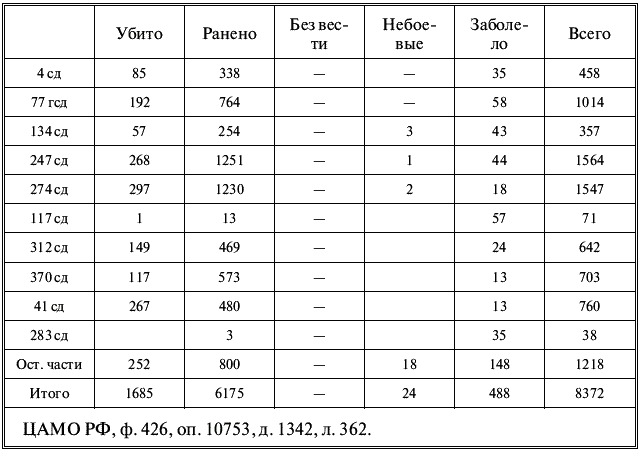 11-й танковый корпус потерял с 16 по 22 апреля 369 человек убитыми и 1291 человека ранеными. Потери техники составили 41 Т-34, 3 ИС-2, 2 СУ-76 сгоревшими, 94 Т-34, 6 ИС-2, 13 СУ-85/СУ-100 и 5 СУ-76 подбитыми [238] . Сравнивая потери корпуса И.И. Ющука с потерями корпусов 2-й гв. танковой армии, приходится характеризовать потери людей и техники 11-го танкового корпуса как высокие. Видимо, это одна из причин, по которой корпус не был упомянут в приказе И.В. Сталина № 339 о прорыве укрепленной полосы.