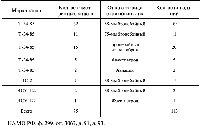 Как видно из приведенных данных, большая часть потерь приходилась на 88-мм бронебойные снаряды. Это могли быть как орудия «Королевских тигров», так и 88-мм противотанковые пушки ПАК-43 различных модификаций. Потери от фаустпатронов незначительные, но имеют место. Это может быть объяснено характером местности, в которой действовала армия.