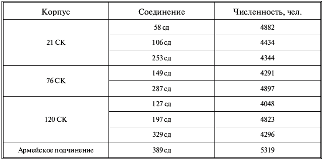 Надо сказать, что к 20 апреля соединения 3-й гв. армии понесли потери, существенно ослабившие и без того не отличавшиеся комплектностью соединения. Потери армии с 10 по 20 апреля составили 1231 человек убитыми и 6207 ранеными, еще 39 человек составили небоевые потери и 486 человек выбыли из состава армии по болезни [252] . Лидерами по общим потерям были 106-я стрелковая дивизия – 732 человек, 253-я стрелковая дивизия – 977 человек, 149-я стрелковая дивизия – 861 человек, 127-я стрелковая дивизия – 1816 человек и 324-я стрелковая дивизия – 1539 человек. При средней численности дивизии 3-й гв. армии перед началом операции в 5000 человек такие потери выводили многие стрелковые части на нижнюю границу боеспособности.Численность соединений 3-й гв. армии на 20 апреля 1945 г.