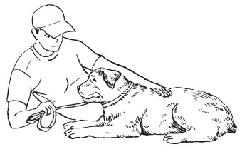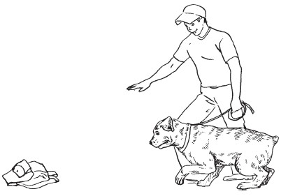 Возьмите собаку на длинный поводок, уложите ее и положите рядом предмет, например любимую игрушку. Следует отметить, что предмет, оставляемый на месте, куда должна вернуться собака, должен быть хорошо знаком ей. Не следует использовать апортировочный предмет.