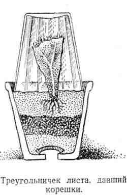 Через тридцать — сорок дней появятся у нижнего обреза корни, а затем и почки, из которых вырастут небольшие листья. Молодое растение сажают в горшок с землёй.