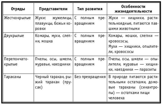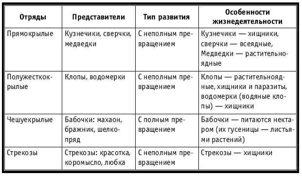 2. Завершить заполнение таблицы с характеристикой основных отрядов насекомых.