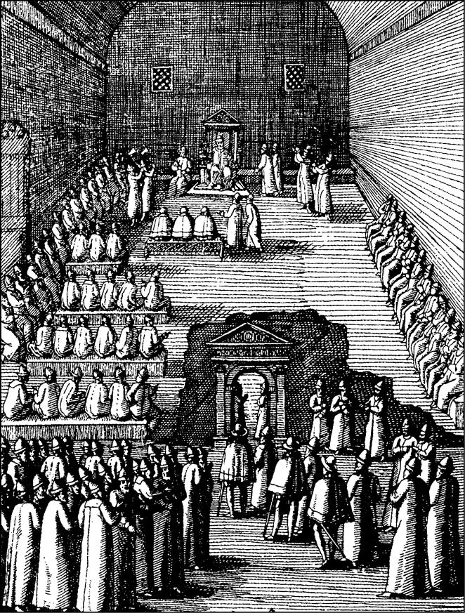 Прием царем Иваном IV иностранных послов в Александровской слободе. Гравюра из книги «Путешествие в Московию» Я. Ульфельда. XVII в.