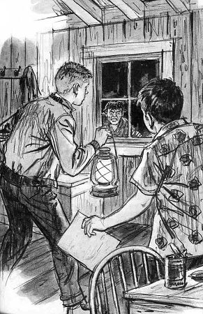 Ребята лихорадочно бросились на поиски, и снова им повезло. В ящике стола лежала смятая коробка спичек. Боб моментально зажег лампу, а Пит нашел кусок жести, чтобы прикрывать свет. Мальчики шагнули к окну в задней стене и вдруг застыли в оцепенении.