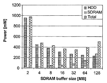 Портативные устройства с накопителем на жестких дисках весьма прожорливы, причем энергопотребление зависит не только от дисковой механики, но и от электроники. К примеру, буферная память большого объема «съедает» не намного меньше энергии, чем электромеханические компоненты. Для определенного битрейта существует некое оптимальное значение объема буферной памяти, при котором ее достаточно для непрерывного воспроизведения контента, и с точки зрения экономии энергии нет смысла использовать диски с бо, льшим буфером. Проблема лишь в том, что нельзя заранее сказать, с каким битрейтом пользователь будет смотреть видео или слушать музыку. Чтобы оптимизировать энергопотребление, компания предлагает сделать в дисках буфер переменного объема – просто-напросто отключать ненужные микросхемы или отдельные банки памяти, что и уменьшит потребление. Займется этим операционная система устройства, которая изменит конфигурацию сразу после получения параметров запущенного на воспроизведение файла с медиаконтентом.