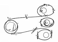 Рис. 11. Схема полета пилотируемой лунной экспедиции по программе Н1-Л3: 1 — старт с Земли с двумя космонавтами на борту; 2 — выведение комплекса Л3 на низкую околоземную орбиту после окончания работы ракетных блоков «А», «Б», «В» ракеты-носителя Н1; 3 — ориентация и запуск двигателя ракетного блока «Г» в расчетной точке орбиты, выведение комплекса Л3 на траекторию полета к Луне, отделение отработавшего блока «Г», сброс нижнего и среднего переходников, блока «Д»; 4 — участок проведения коррекций с использованием двигателей многократного запуска ракетного блока «Д»; 5 — построение лунной орбиты с использованием двигателя блока «Д»; 6 — переход одного космонавта через открытый космос из спускаемого аппарата лунного орбитального корабля (ЛОК) в кабину лунного корабля (ЛК); 7 отделение ЛОК от сборки «ЛК + ракетный блок „Д“, сброс верхнего переходника и раскрытие посадочных опор ЛК; 8 — последнее включение двигателя блока „Д“ для работы на участке торможения при посадке на Луну, окончание работы блока „Д“ и его отделение от ЛК на высоте ~ 1 км над поверхностью Луны, включение двигателя ЛК для торможения на конечном участке посадки на Луну и выполнения посадочного маневра; 9 — посадка на Луну, выход космонавта на поверхность, телерепортаж, возвращение в лунную кабину ЛК (время пребывания на Луне 4ч); 10 точка падении на Луну отработавшего ракетного блока „Д“; 11 повторное включение двигателя ЛК на режим взлета с Луны, отстыковка взлетного модуля ЛК от посадочного, 12 — выведение взлетного модуля ЛК в зону стыковки с орбитальным кораблем; 13 — стыковка на лунной орбите двух пилотируемых космических кораблей, переход космонавта через открытый космос из ЛК в ЛОК, отстыковка ЛК; 14 — запуск двигателя ракетного блока „И“ в расчетной точке лунной орбиты и выведение ЛОК на траекторию возвращения к Земле; 15 — участок проведения коррекций с использованием двигателя ракетного блока „И“; 16 — отделение спускаемого аппарата с двумя космонавтами; 17 — участок управляемого спуска с двумя погружениями в атмосферу; 18 — срабатывание парашютной системы и мягкая посадка в заданном районе.