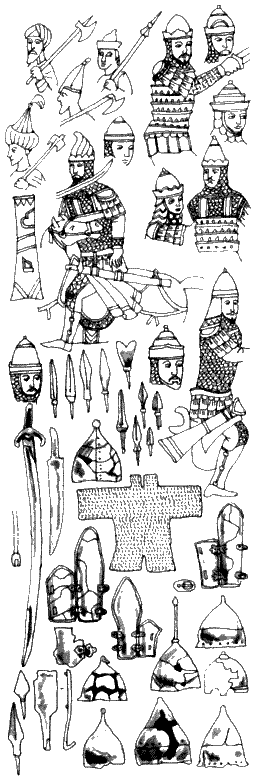 Основу комплекса защитного вооружения этого воина составляет чешуйчатый доспех с чешуйчатыми оплечьями. Шлем – довольно типичный для начала 14 века, высокий, с длинным шпилем и чешуйчатой бармицей. Щит – круглый, сплетённый из прутьев, сквозь которые продеты цветные ленты, не только образующие затейливый узор, но и придающие щиту дополнительную прочность. По центру щита – металлический умбон. Такие щиты обычно называли «халха». Воин вооружён луком, длинным копьём с не слишком большим листовидным наконечником, палашом и кинжалом.