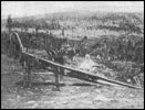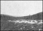 Фиг. 8. Левый склон долины р. Малого Патома с золотоносной россыпью на двух уровнях — на дне долины (спереди) и на террасе, над обрывом, где сидит человек