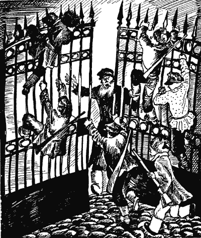 Подбежали ребята к воротам. Поднавалились. Кто смелее, по прутьям наверх полез.