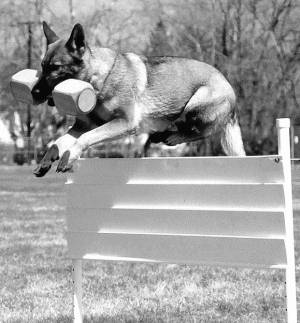 6. Апортировка предмета весом 650 г с безопорным прыжком через препятствие высотой 1 м и шириной 1,5 м. Используются команды «Барьер!», «Апорт!», «Дай!», «Рядом!».