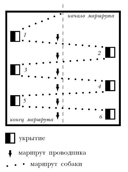 Проводник не может отходить от средней линии, но имеет право направлять овчарку жестами и повторять команду, посылая ее к следующему укрытию.