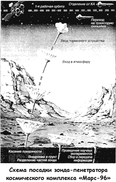 Особый интерес представляют зонды-пенетраторы. Схема их посадки на Марс выглядела следующим образом. Перед отделением от космического аппарата производится закрутка каждого зонда относительно продольной оси. После отделения включаются твердотопливные двигатели, которые обеспечат его торможение и сход с орбиты. Перед входом в атмосферу наполняется газом надувное тормозное устройство, а в момент удара о поверхность планеты происходит разделение двух частей пенетратора: внедряемой, проникающей на глубину до 4–6 метров, и хвостовой, остающейся в поверхностном слое грунта. После посадки из хвостовой части зонда выдвинется передающая антенна с телекамерой и датчиками научной аппаратуры.